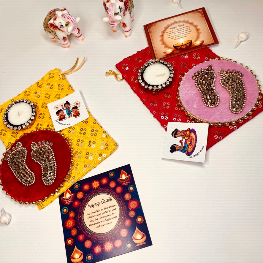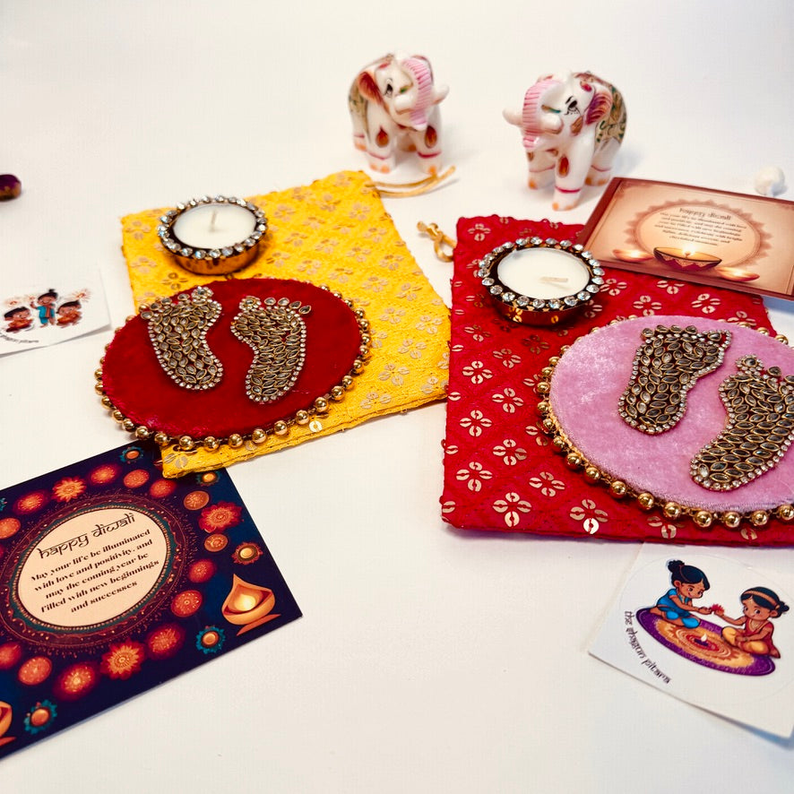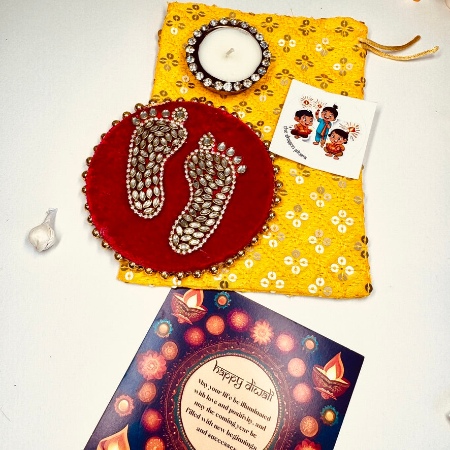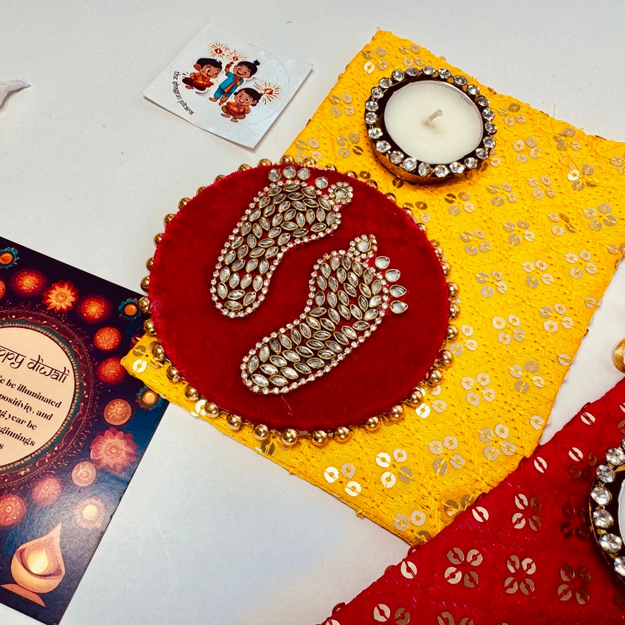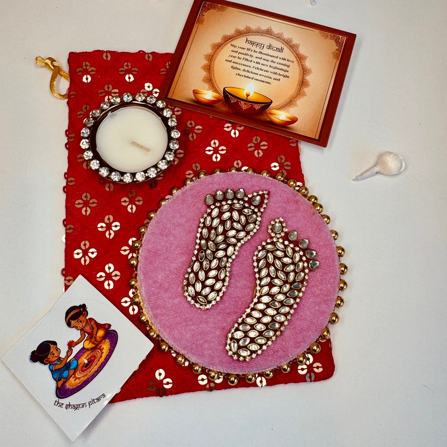 Please note: The color of the Lakshmi Charan and potli will be randomly selected from the available options to add an element of surprise and excitement.