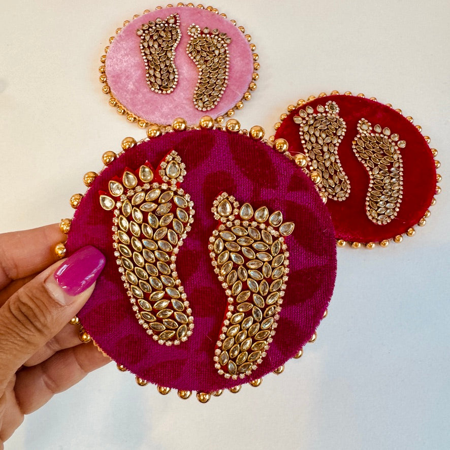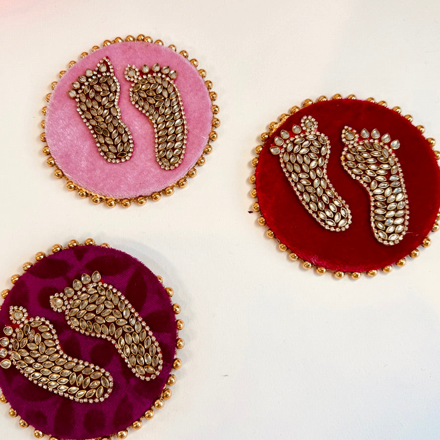 - A Lakshmi Charan crafted on a regal velvet base, intricately adorned with kundan, approximately 4 inches in diameter, symbolizing divine blessings.