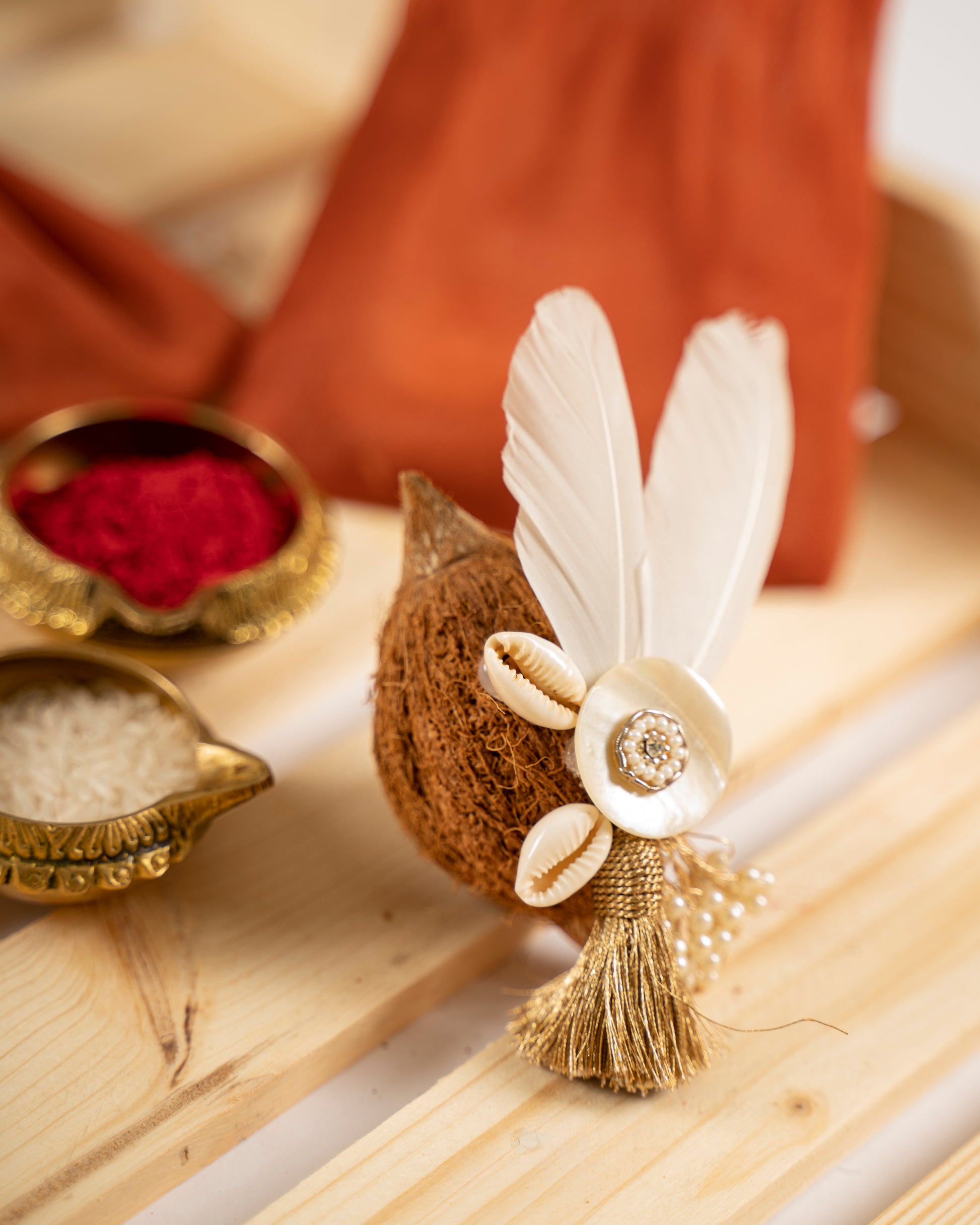 - Feather embellished Nariyal, adorned with exquisite detailing, perfect for the shagun ritual.