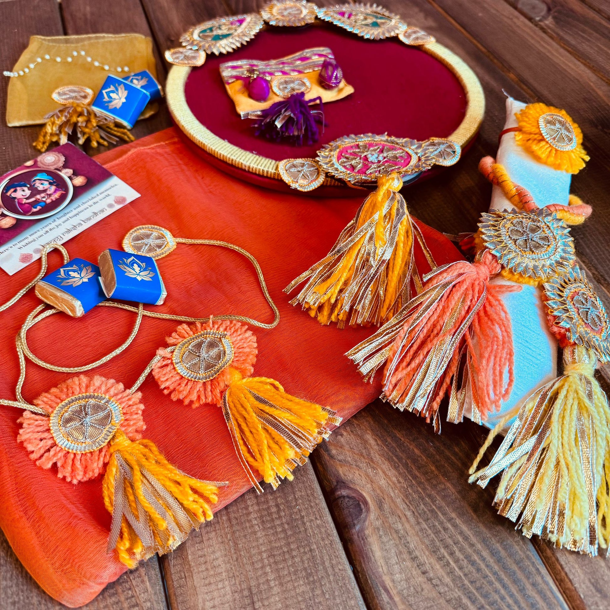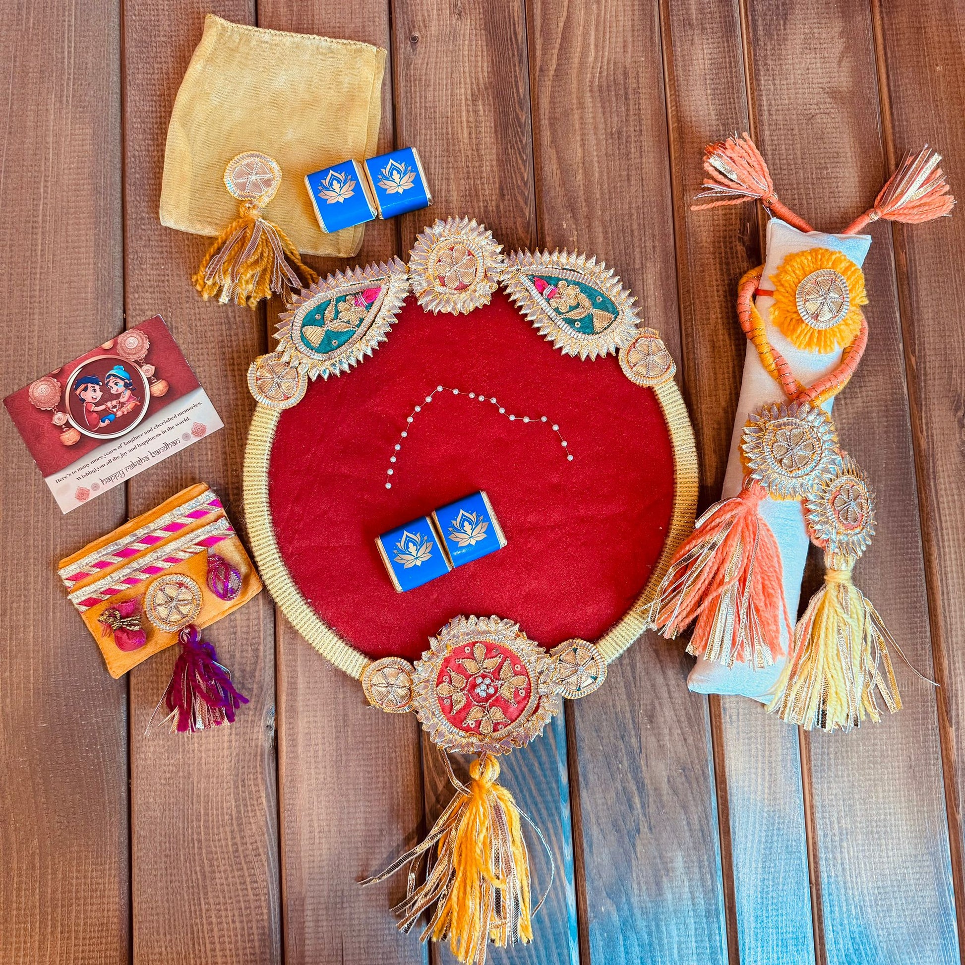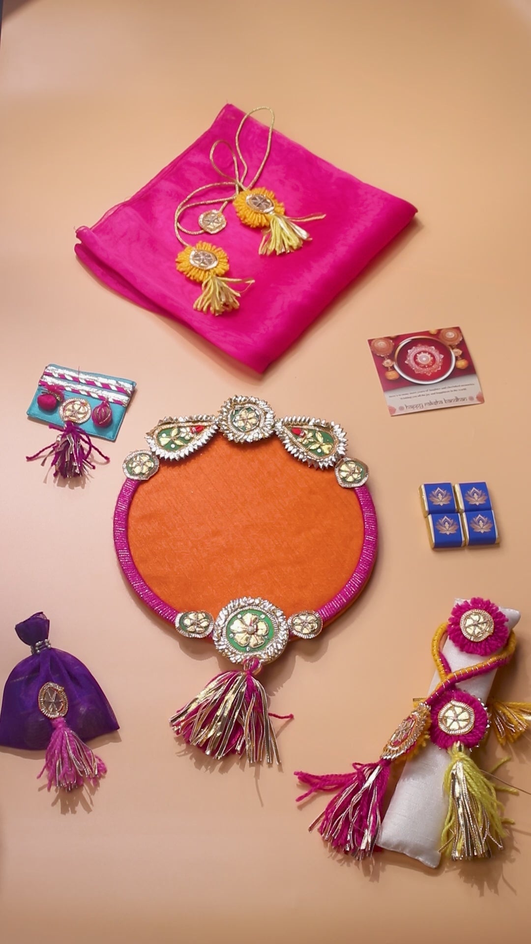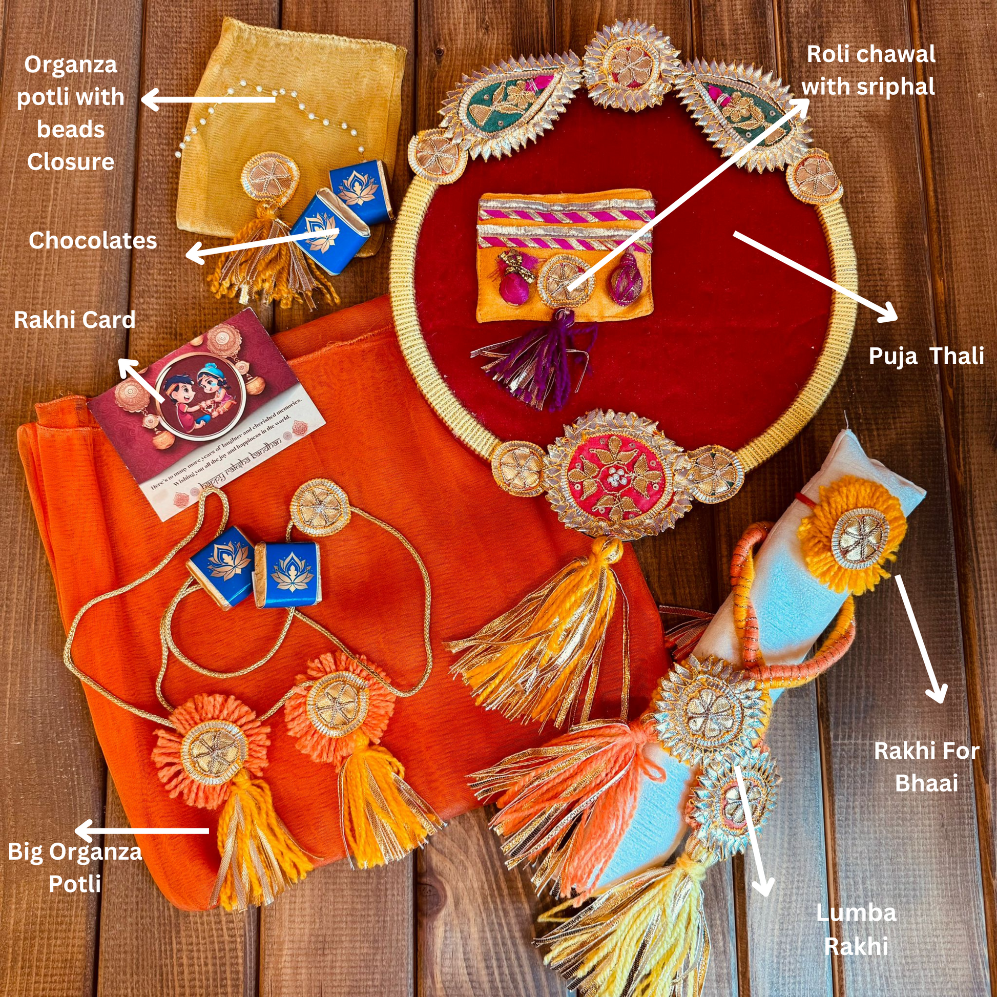 Step into the vibrant world of Rang Barse with our stunning Bhai Bhabhi Rakhi set, intricately designed with exquisite gota pati and chic tassels. Behold the grandeur of our collection with the following inclusions: