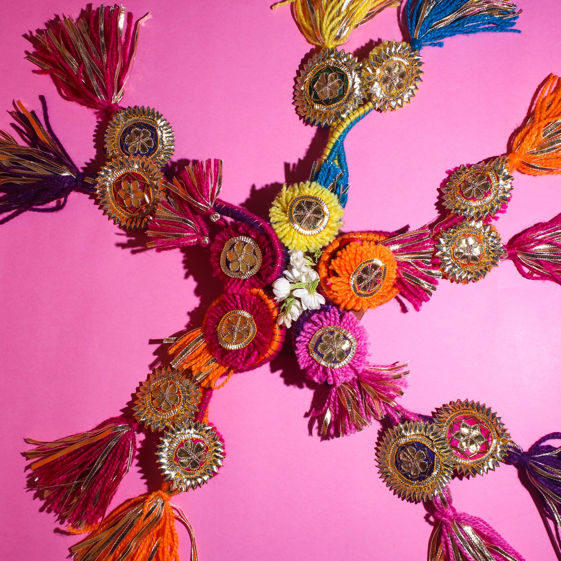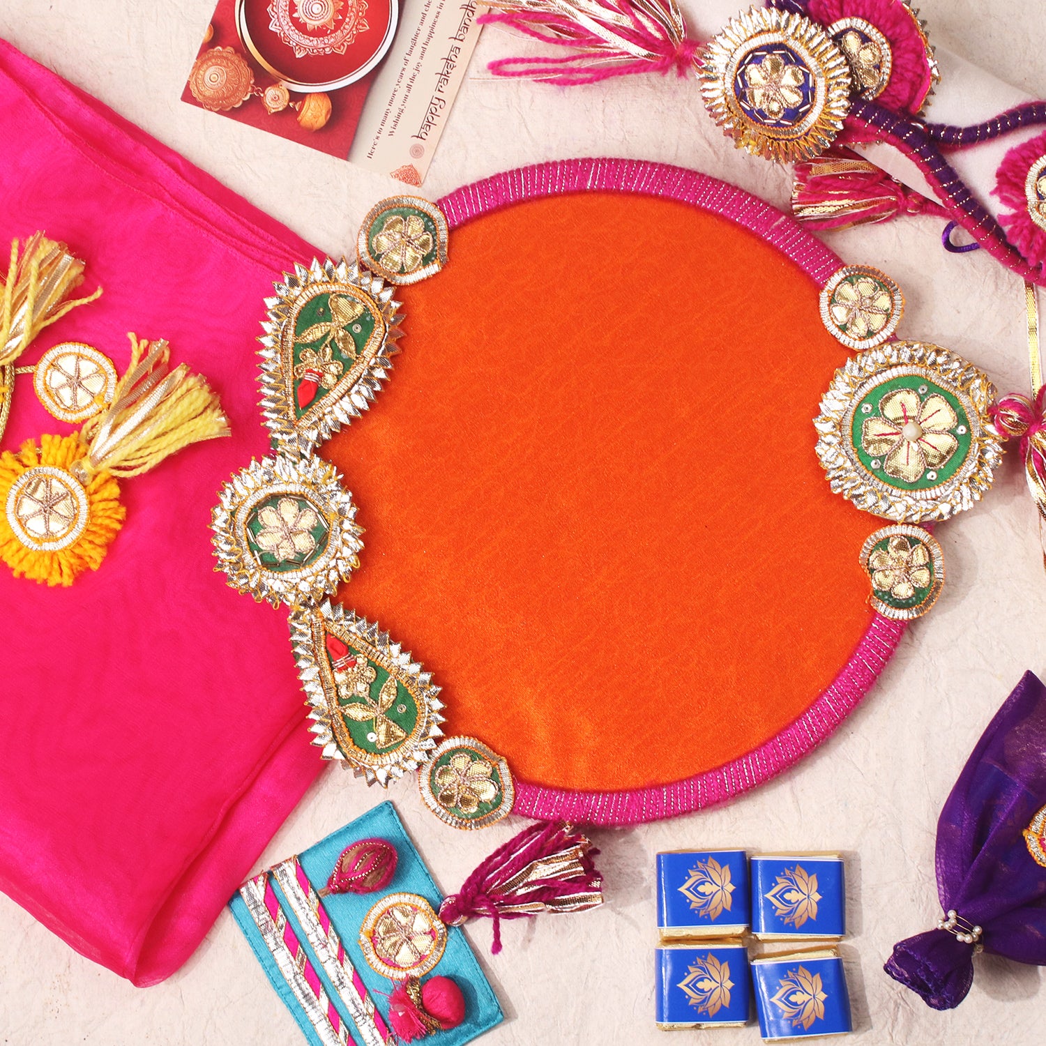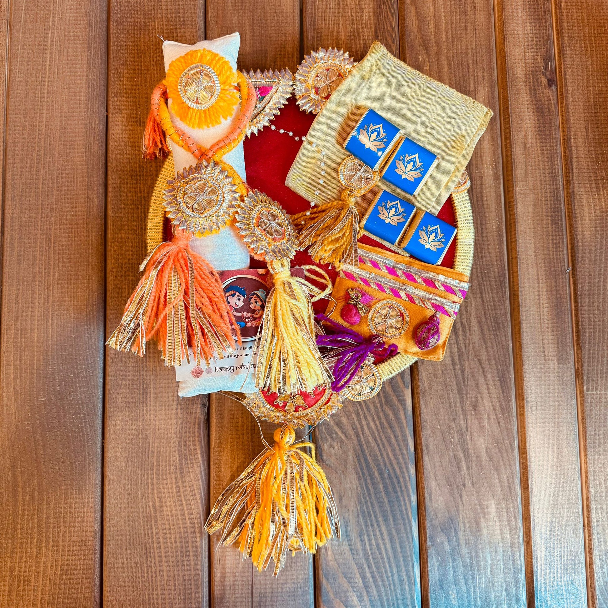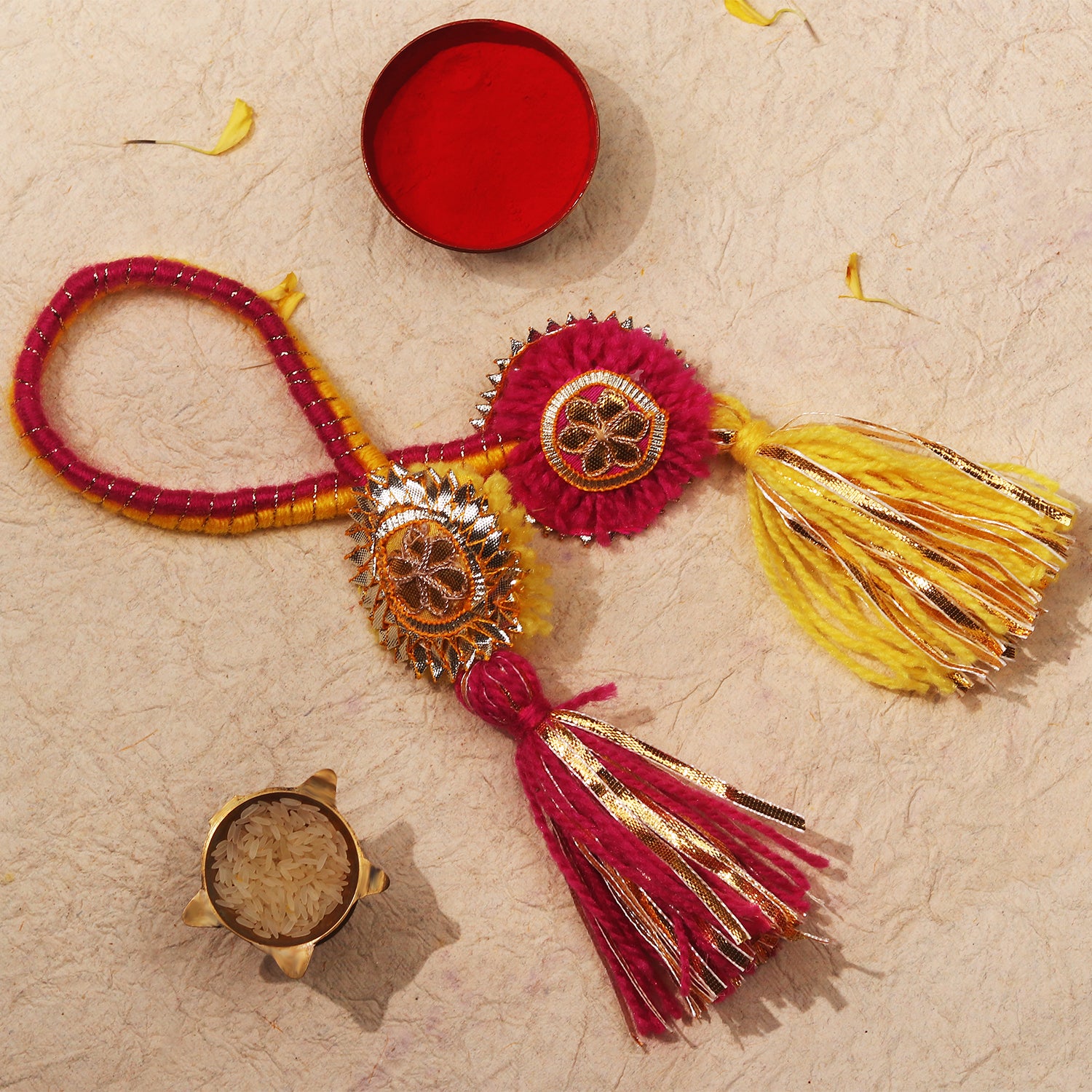 Step into the vibrant world of Rang Barse with our stunning Bhai Bhabhi Rakhi set, intricately designed with exquisite gota pati and chic tassels. Behold the grandeur of our collection with the following inclusions: