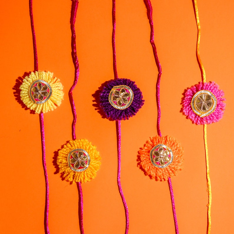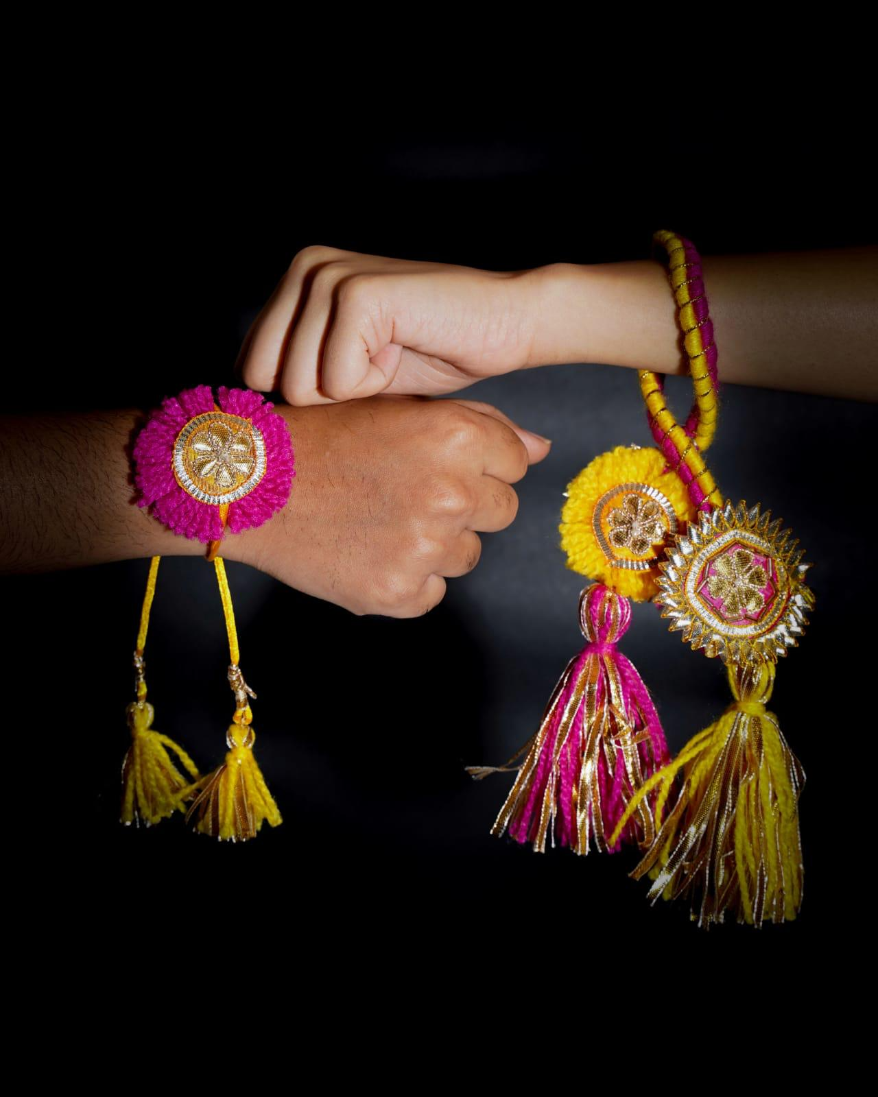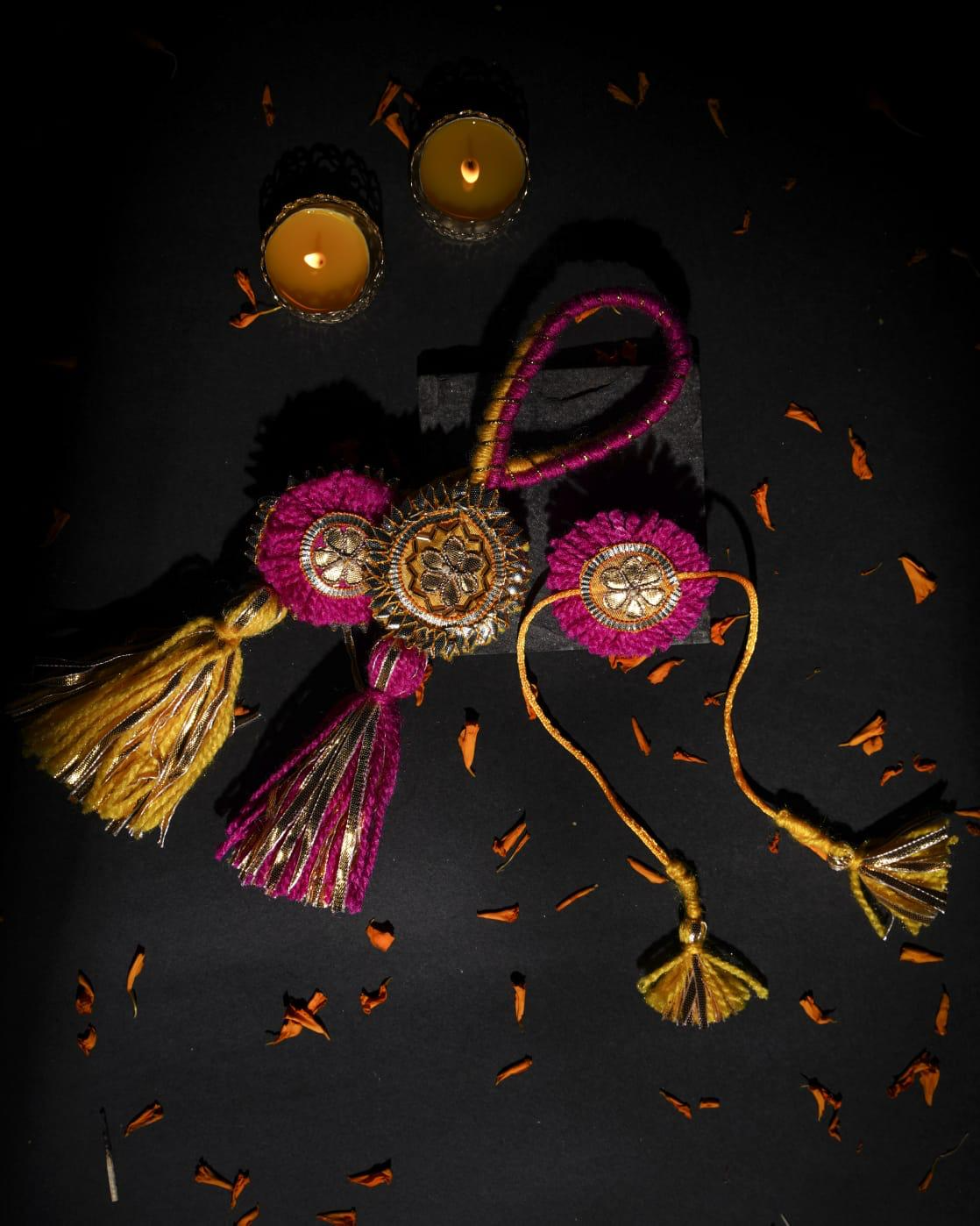 Celebrate Raksha Bandhan with our vibrant Bhaiya Bhabhi Rakhi set. Don't miss out on our exciting Rakhi collection! π Handcrafted with colorful woolen threads and intricate gotta patti detailing, these rakhis are perfect for celebrating Raksha Bandhan in style.