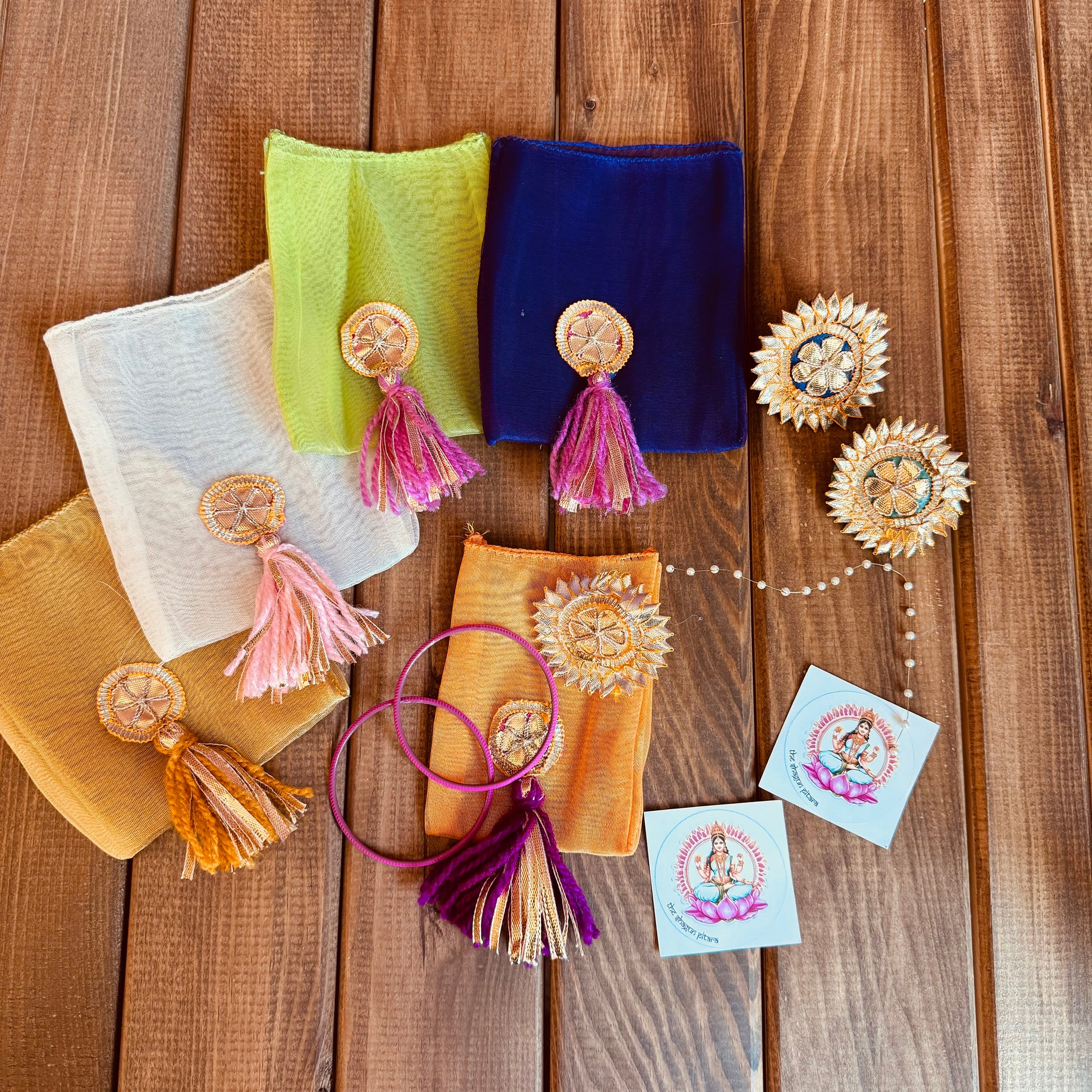 Please note: The color of the potli will be randomly selected, adding an element of surprise to your celebrations. If you have any preference do message us.