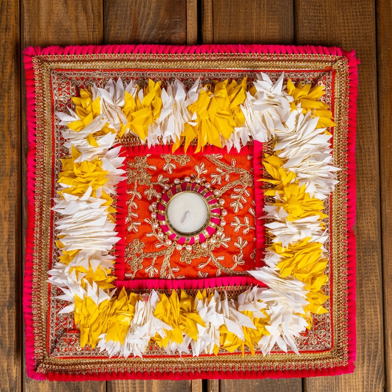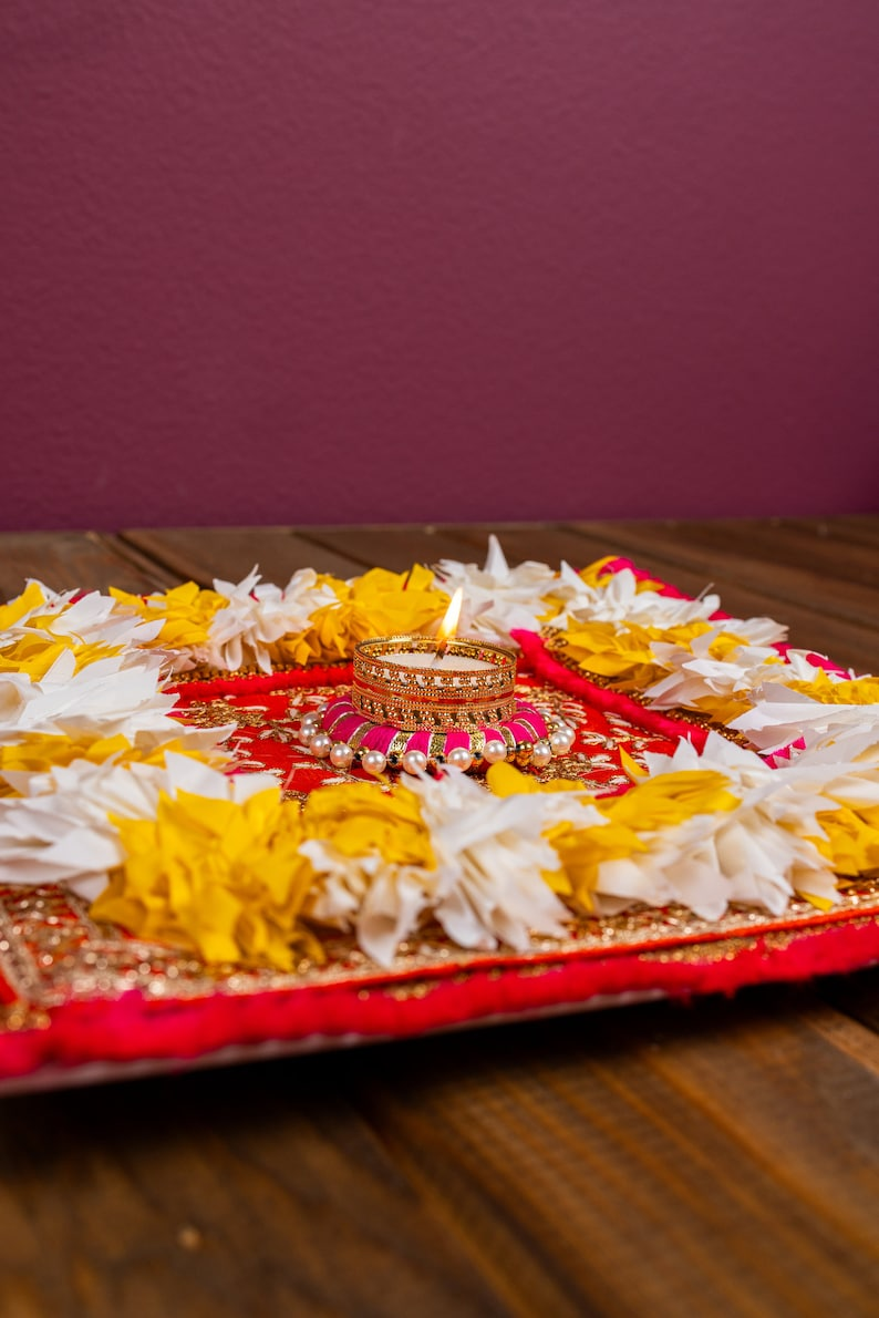Enhance your Diwali celebrations and other festive occasions with our elegant Zari Mat, perfect for your entryway or center table. This dazzling piece features a tea light in the center, creating a warm and inviting ambiance.